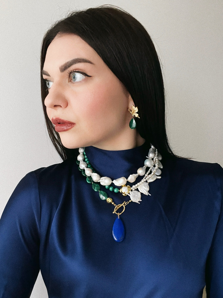 Materials: 6 mm shell pearls, 8 mm natural sodalite, 35 mm natural baroque Keshi pearl, 18/24k gold plated brass...